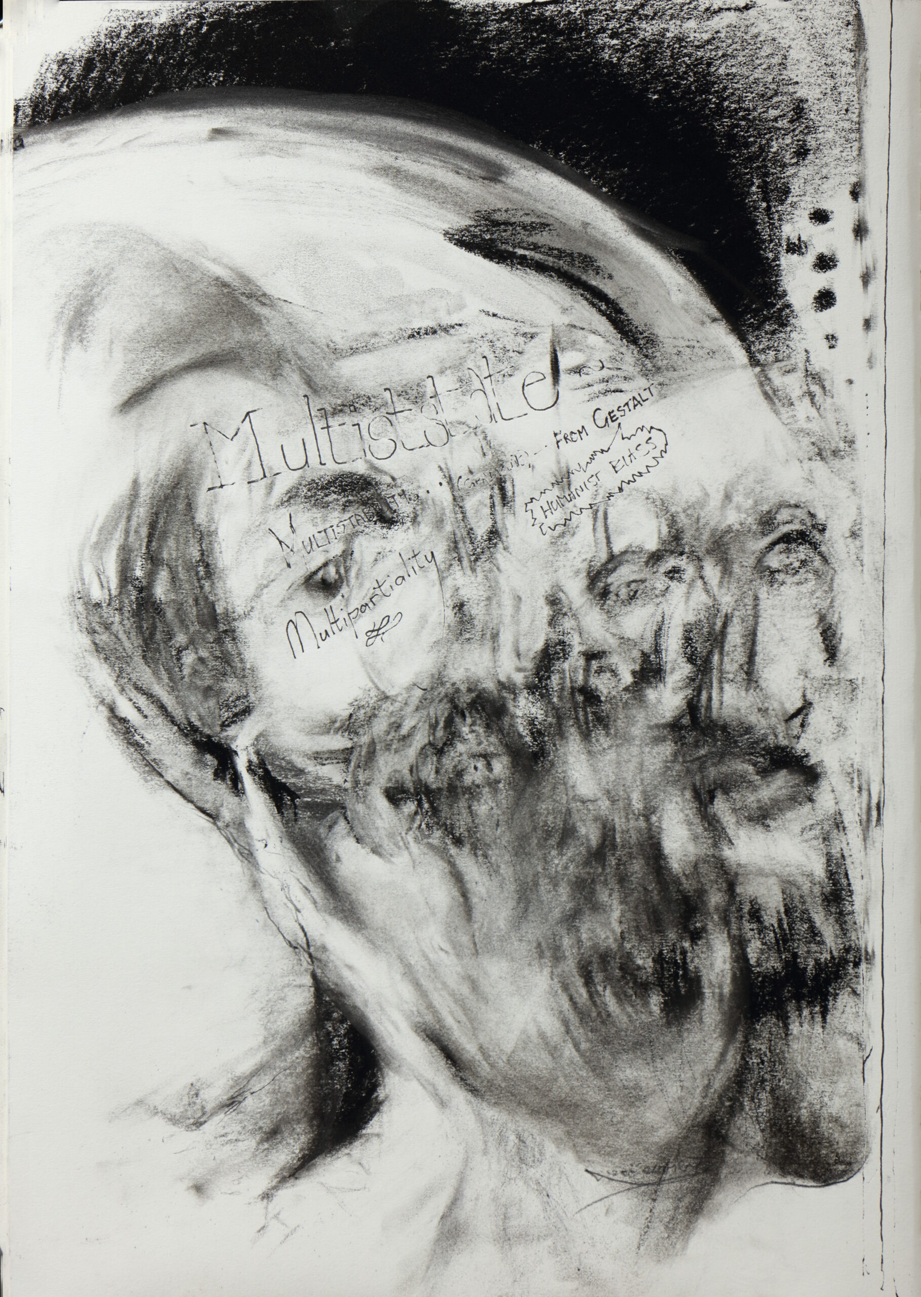Multistate~: a portrait-field made to code-switch. Charcoal/graphite/carbon ink, plus dust recovered from discarded drawings (pyrolysis → pigment → return). Faces cohere, dissolve, re-cohere; text attempts governance; the substrate disputes it. Signed at the throat of the outer mask — authorship as another layer, grazing the drawing’s voice.