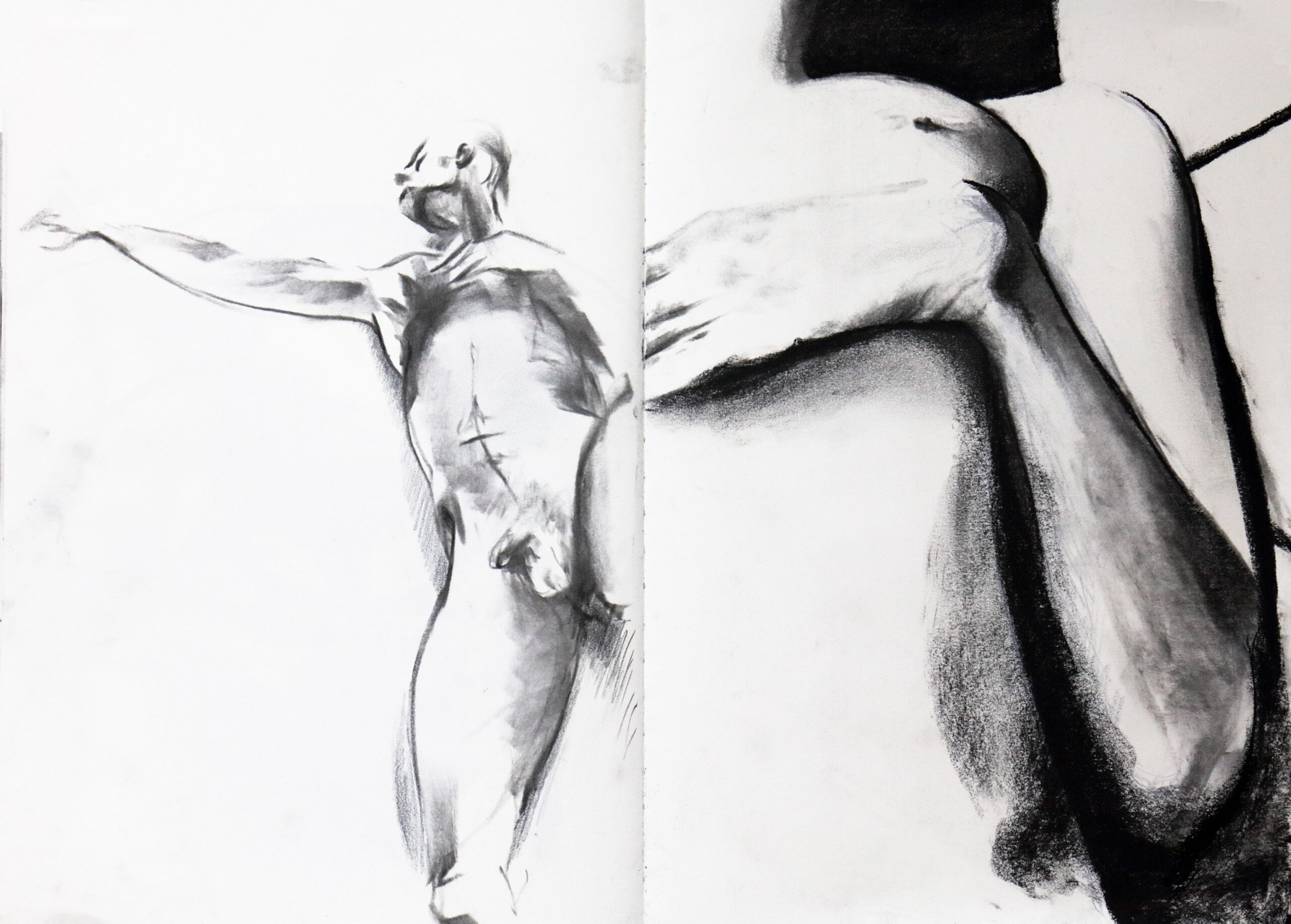 Left: Gustav, charcoal. Open gesture, arms extended, head tilted back. Decompression.