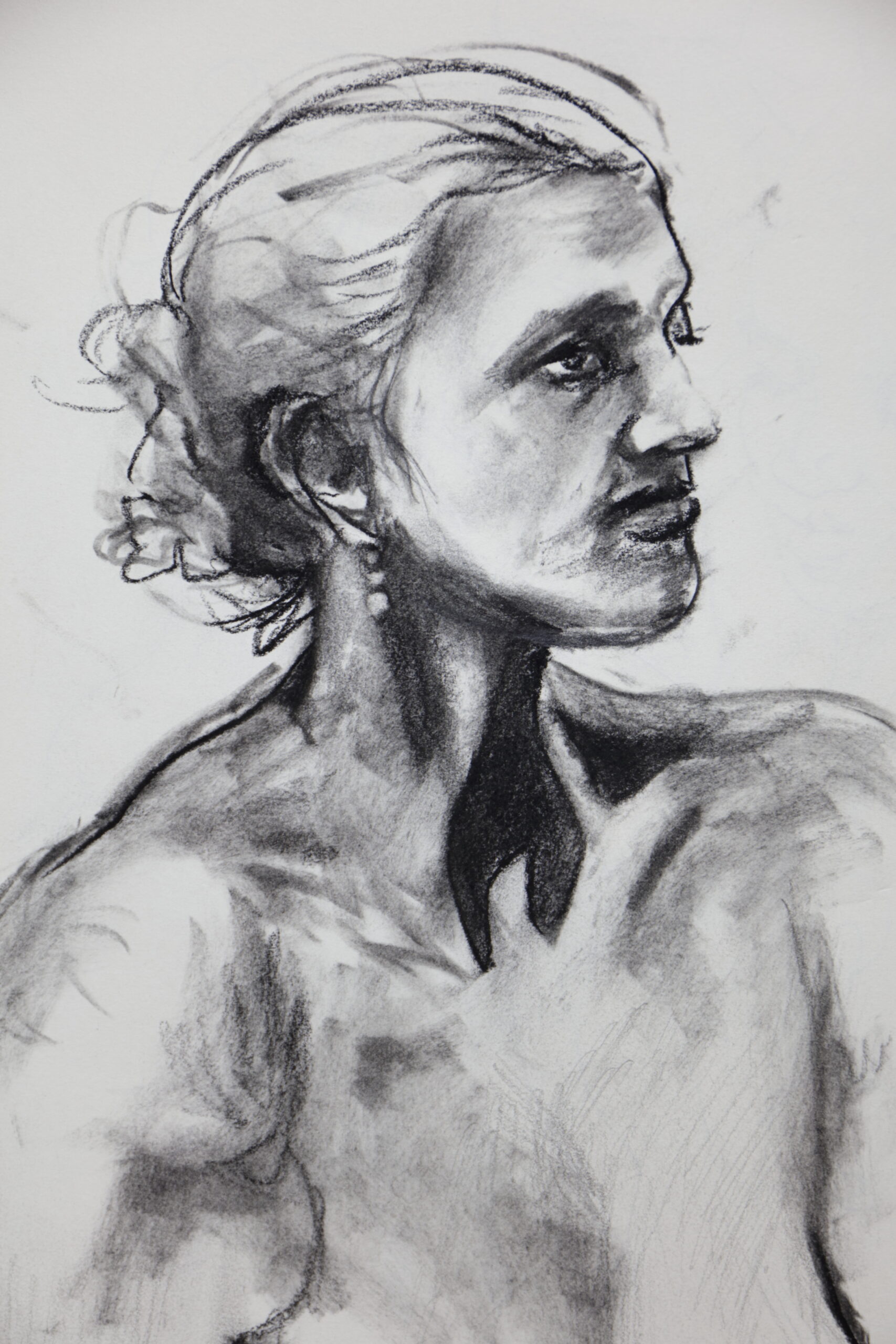 Carl Jeppe’s life-drawing group, Arcadia, Pretoria — 12 April 2026. Gravity-feed fountain pen on upright sketchbook, with matt graphite and fine charcoal powder blends on the tonal pages.