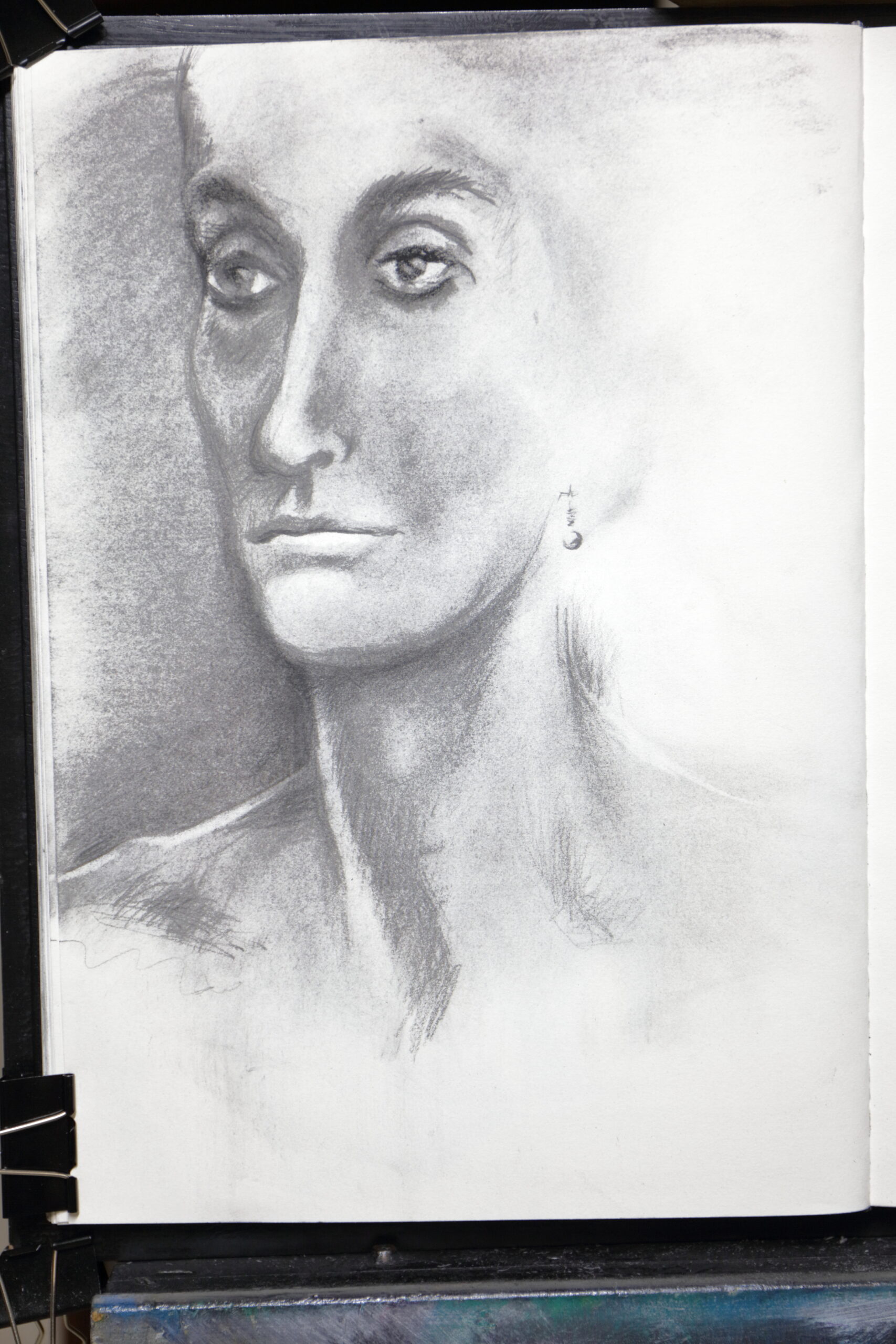 The session’s last page. A three-quarter head study. The proportions have drifted (the nose runs long — “you could go skiing down that nose,” the sitter remarked, kindly). And yet the tonal volumes held.