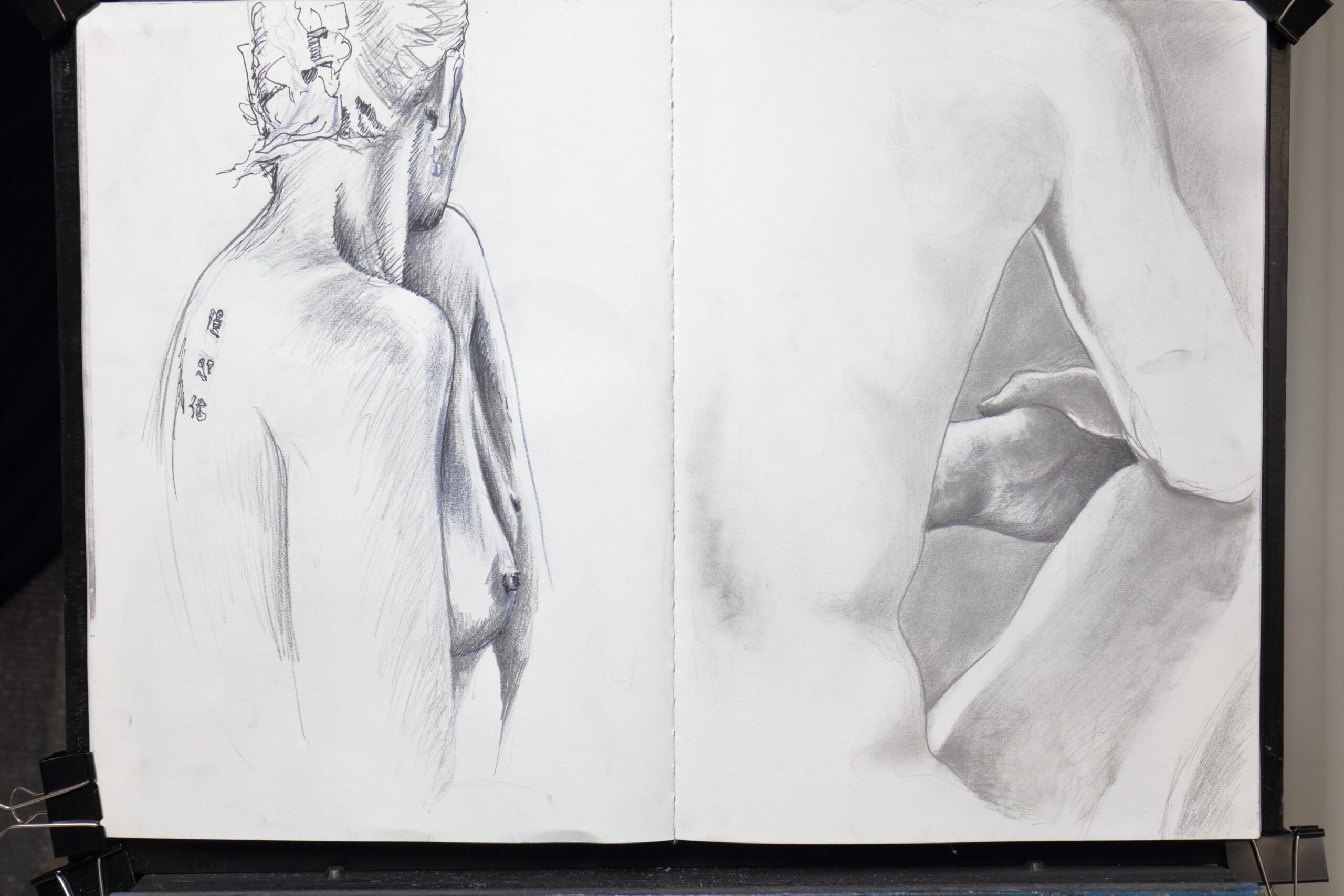 The penultimate spread of the day. Left page: back-turned, a hair-clip holding a cascading vortex of hair, matt graphite contour hatching over fine charcoal powder blends. Right page: a zoom-in on a hand holding a knee, mostly blended pencil work with an almost darkroom aspiration toward subtle tonality. The arm sweeps in from the top-right and ends near the gutter. Ghost-marks in the upper-left. The binding itself becomes visible — the spine of the sketchbook, its texture of fallibility.